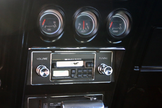 The seats have been recovered with black and silver Mach 1 seat covers. The interior of the car has been restored with new seat covers, carpet, door panels, and armrests. New cassette player with new bezel.